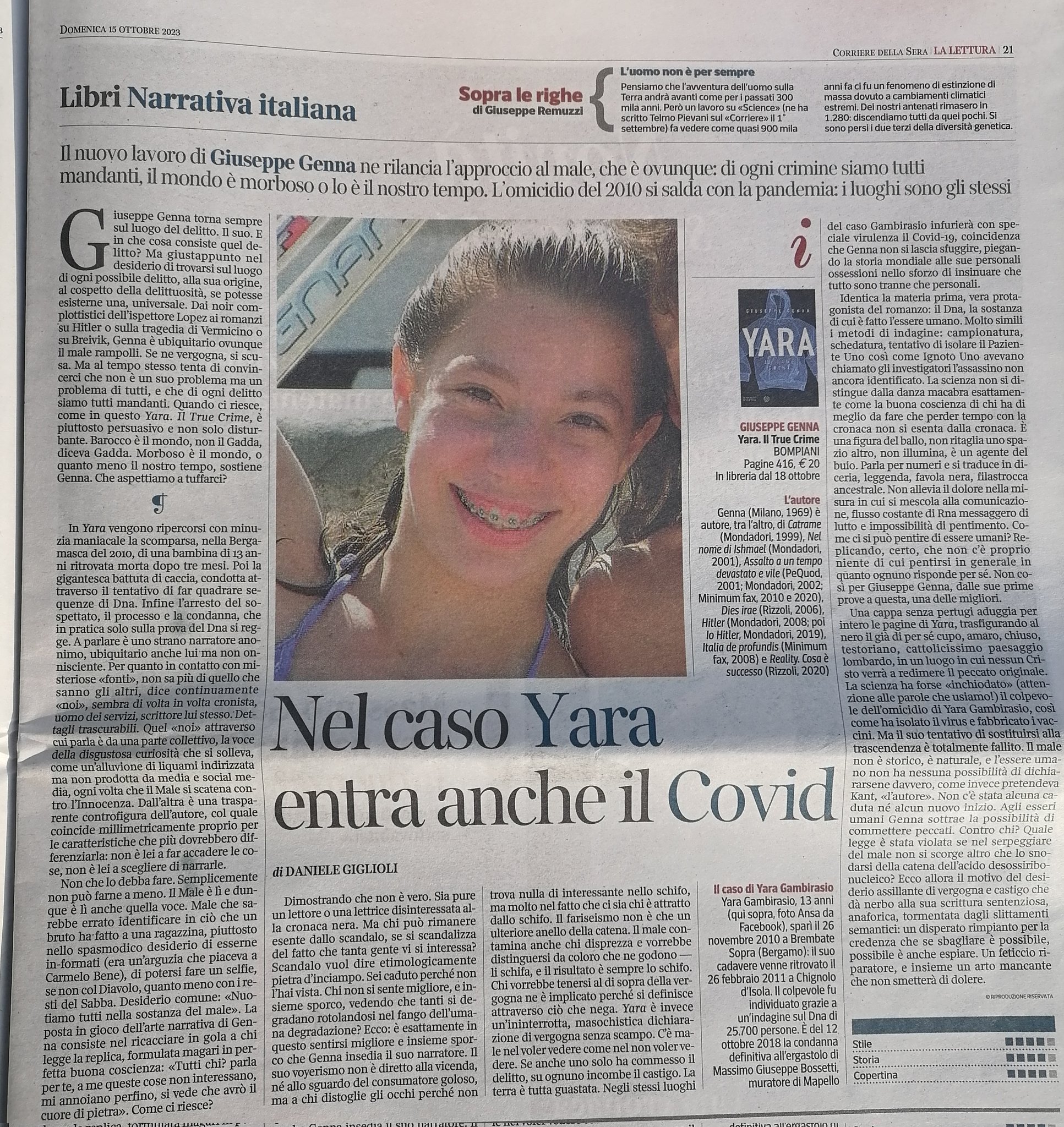 YARA. Il true crime è un romanzo che si propone come true crime atipico, in quanto eminentemente letterario, secondo i canoni di epica, tragedia e lirica. Non ha nulla del cronachismo giornalistico o del saggismo investigativo o documentario. Tantomeno propone qualcosa di documentale. Non c’è proprio ambizione di illustrare o, peggio, di *rivedere* il caso (questa terminologia orrenda…) che ha per vittima la tredicenne Yara Gambirasio, di Brembate di Sopra, scomparsa la sera del 26 novembre 2010 e ritrovata senza vita esattamente tre mesi dopo, in un campo a Chignolo d’Isola, a pochi minuti dal paese d’origine. Il tentativo in scrittura è di tutt’altro genere: finzionale nel senso della ricerca morale e metafisica che riguarda questo evento criminale, uno spartiacque per il Paese (ma non soltanto per questo Paese), dove tra indizio e prova ci si perde in abisso, mentre l’oscenità mediatica inaugura una stagione completamente trasformata, con l’avvento del digitale. Ogni terapia è portata allo zero. La ricerca del colpevole prende i contorni di un’indagine inflessibile costretta a flettersi nel tempo e nello spazio. Riporto qui di seguito il testo dell’aletta del libro Bompiani: “Il 26 novembre 2010, a Brembate di Sopra, poco lontano da Bergamo, una ragazzina esce di casa per andare al campo sportivo. Non farà mai ritorno. Di lei non si sa più nulla per tre mesi esatti: il 26 febbraio 2011 viene ritrovata in un campo, priva di vita. Dal giorno successivo alla scomparsa ha inizio un’indagine senza precedenti per i metodi scientifici messi in atto, per il clamore mediatico, per il dispiegamento di energie civili e militari, per la quantità di svolte investigative. Nel giugno 2014 la procura arresta un uomo, poi condannato all’ergastolo. Nei luoghi di questo dramma, di lì a pochi anni, si manifesta l’esordio in occidente della più virulenta epidemia dei tempi moderni, proprio dove si è organizzata la più vasta campagna di tamponi molecolari per individuare l’origine delle tracce genetiche trovate sugli abiti della vittima. Mentre per le valli risuona un’antica filastrocca che narra di una principessa uccisa dal conte di cui aveva rifiutato le attenzioni, il tempo e lo spazio sono scanditi dal nome di Yara: perché al centro di tutto c’è lei, Yara Gambirasio. Con la sua innocenza assalita dai fiumi di parole dei massmedia. Perduta in un intrico più grande dei nostri pensieri. Eppure, per sempre, Yara, con il suo sorriso che entra nella memoria collettiva e chiede salvezza. Sono questi alcuni fili della ragnatela di significati e misteri che fa della storia ricostruita in queste pagine una delle più impressionanti allegorie del nostro tempo. Un tempo tragico, vorace di vite altrui, pronto a esultare di fronte all’esposizione del dolore e della colpa, al quale Giuseppe Genna dà voce in modo potente, allineando sulla pagina dettagli con ossessiva precisione. Questo romanzo è, così, una plastica rappresentazione del nostro fallimento civile e un dolentissimo requiem per la limpidezza che, insieme a Yara, abbiamo perduto per sempre”.