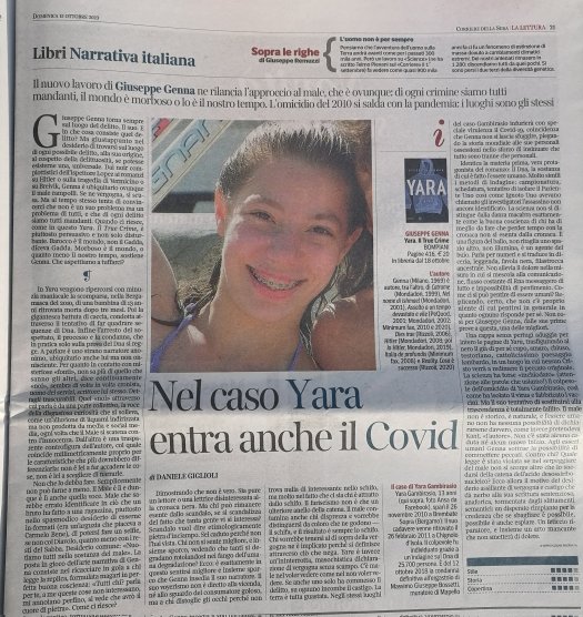 Si esprime su “Yara. Il true crime”, il libro in uscita tra tre giorni per i tipi Bompiani, uno dei più importanti e apprezzati critici e teorici italiani della letteratura, Daniele Giglioli, autore tra gli altri titoli dei fondamentali “Senza trauma” (Quodlibet, 2011) e ”Critica della vittima” (nottetempo, 2014). E lo fa sulle pagine del prestigioso inserto culturale del “Corriere della Sera”, ovvero “La Lettura”. Vengono sollevati temi, visuali, ossessioni, ontologie e morali sballate che l’autore sottoscritto mette in campo via via. Ecco qui di seguito l’intervento integrale, il cui testo continua sotto la foto, la quale è essa stessa leggibile cliccandola e ingrandendola.