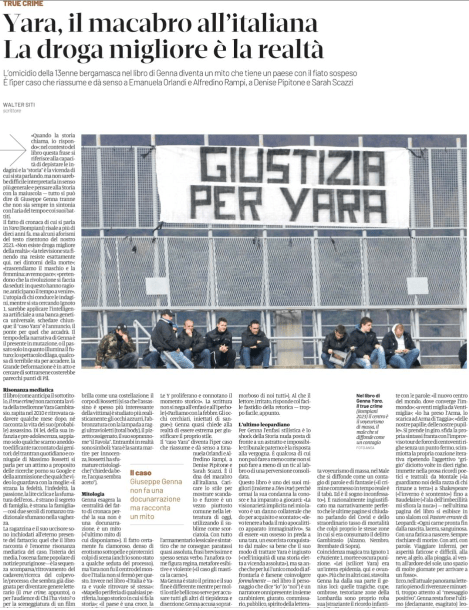 Sulle pagine culturali del quotidiano “Domani”, lo scrittore e critico Walter Siti è intervenuto a proposito del nuovo romanzo, Yara. Il true crime (Bompiani), a una settimana dall’uscita. E’ un articolo che consiste in un piccolo saggio, che riguarda la totalità della mia scrittura e che mi onora. Lo riporto qui sotto l’immagine della pagina del giornale.