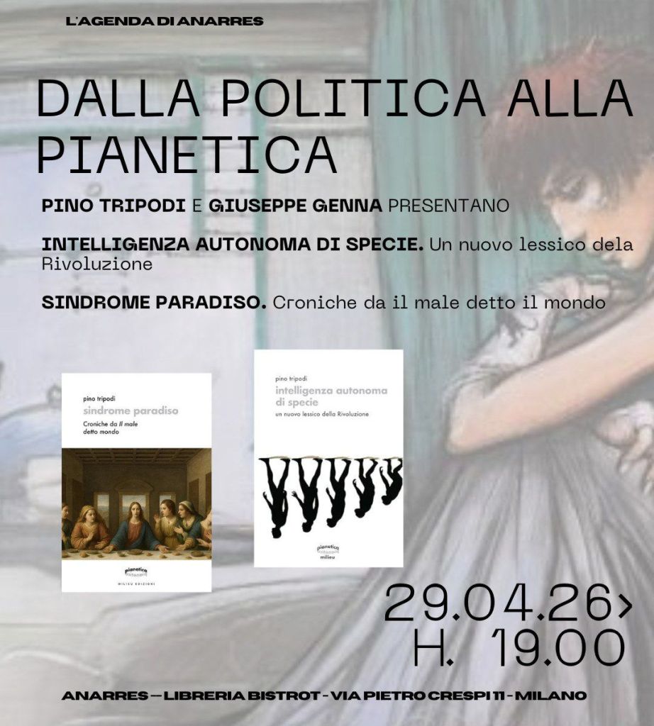 Milano, mercoledì 29 aprile alle ore 19, libreria Anarres in via Pietro Crespi 11: il sottoscritto presenta il saggio Intelligenza autonoma di specie [me ne sono occupato qui, ndr] e la narrazione extracanone Sindrome Paradiso, due testi eterodossi usciti in contemporanea per i tipi delle edizioni Milieu.